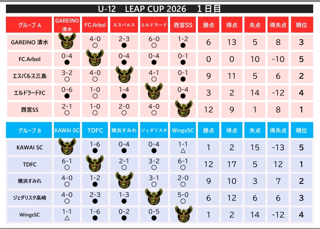 U-12 LEAP CUP 2026 1日目結果